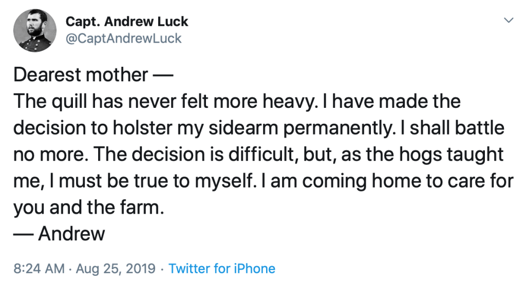 The Colts QB retired. As previously reported here, the Twitter account “Captain Andrew Luck” was a humorous feed in which Andrew Luck was portrayed as a Civil War officer. Each week he would tweet short notes home to his mother, as in a Civil War diary. Here is the entry from last week after the retirement announcement.