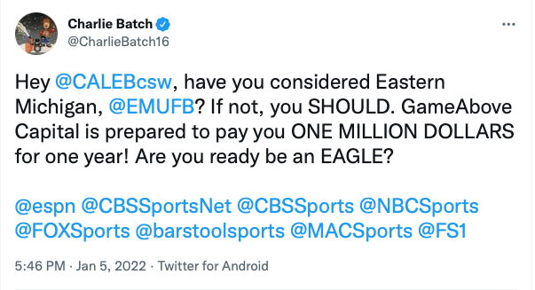 Earlier this week Oklahoma freshman starting QB Caleb Williams entered the transfer portal for the sole purpose of ‘gauging his value’. According to former EMU and Pittsburgh Steeler QB Charlie Batch, his value is at least $1 million to live in Yipslanti, MI. I wonder what the Wolverines, in the next town over, will offer?