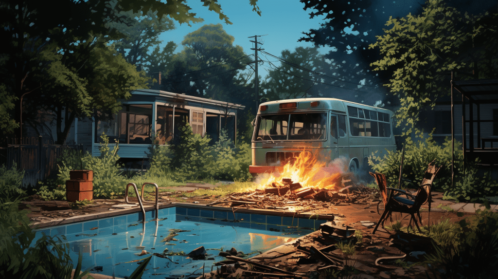 If this game were an actual backyard, it would feature a 3 foot high chain-link fence surrounding a patchy lawn. Closer to the house is the above ground pool with green water. Further out, there is a faded yellow school bus parked against the fence with the hood up. Three bus seats are set on the ground around a large hole that serves as a fire pit. There is charcoaled furniture still smoldering from last week’s burn.