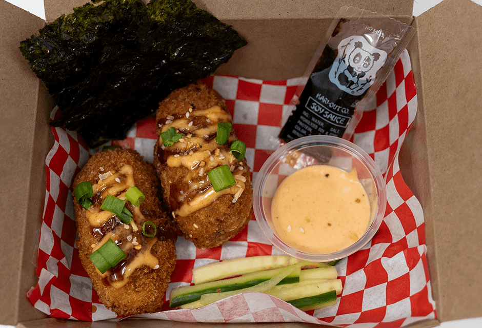 “Sushi rice is generously topped with imitation crab meat and perfectly seasoned salmon for a quick bake. The sushi bake is then rolled in panko breadcrumbs and deep-fried until golden brown and served with a side of seaweed and Yum Yum dipping sauce.”