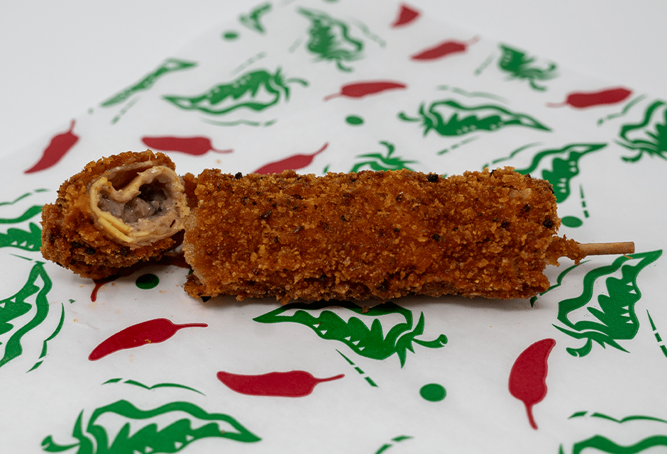 “This cheesy, savory roll-on-a-stick is the perfect State Fair treat! Made with slow-smoked, shredded, Texas BBQ beef brisket, melted, gooey Velveeta®, and cream cheese, seasoned with Meat Church Texas Sugar Rub®, then rolled in a pasta sheet, wrapped up in hickory smoked bacon, and rolled in jalapeño breadcrumbs. It’s a savory bomb that’s going to be nearly impossible to put down!