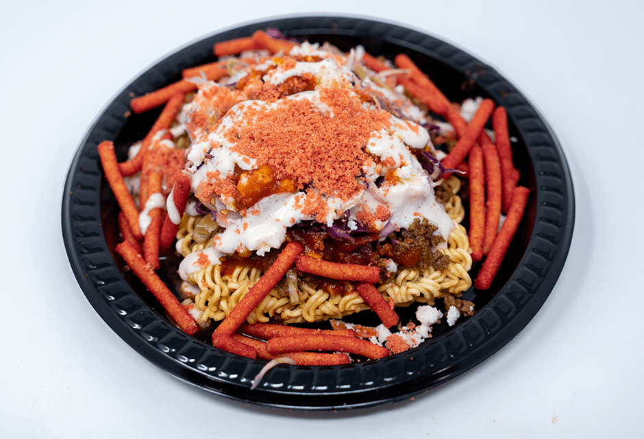 “A ramen noodle cake is flash-fried, smothered with made-from-scratch savory seasoned taco meat, and topped with crispy Asian sesame seed slaw and a drizzle of garlic lime aioli. Finally, Mexican queso banco and crumbled Takis® are sprinkled on top to complete this Mexican-Asian fusion dish.”
