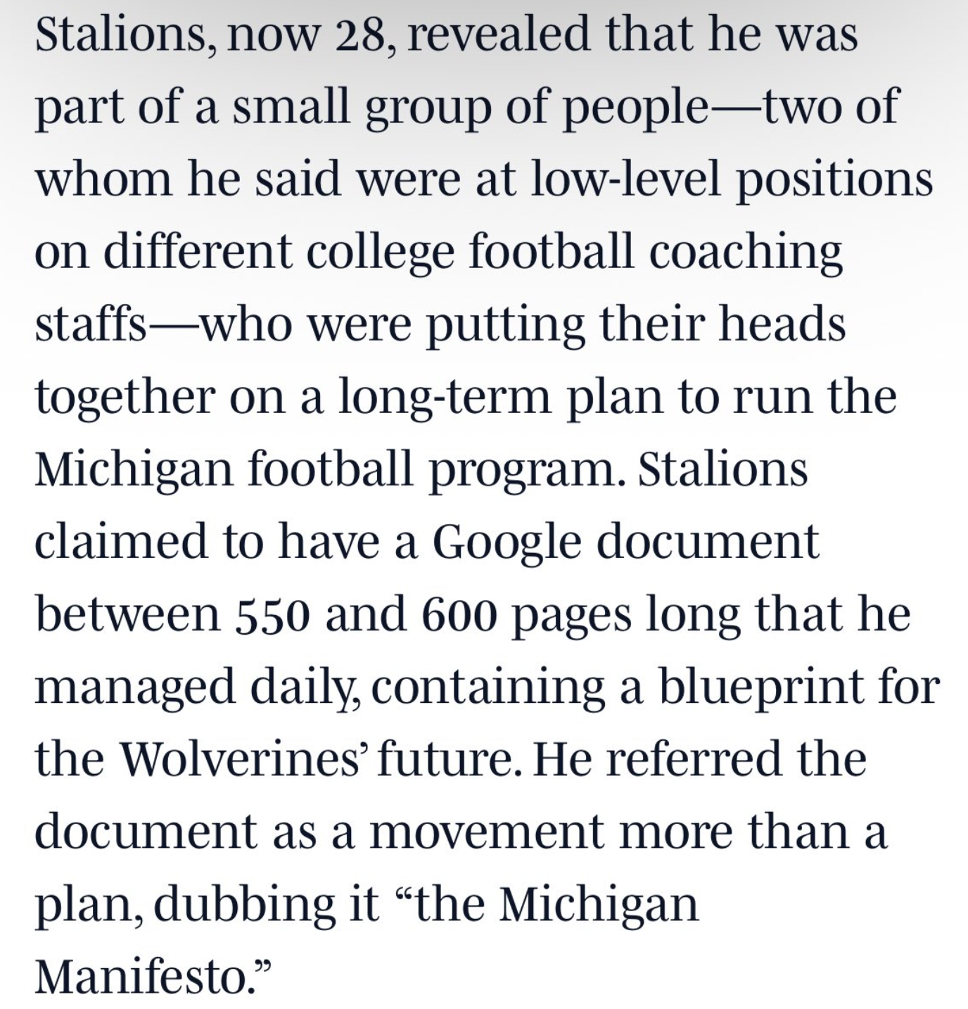 Connor Stalions, a former Marine, a Michigan recruiting analyst, considered a low-level employee, is a hard-charging football-wannabe. He is alleged to be writing a ‘Michigan Football Manifesto’ that is currently 600 pages long, outlines the future of the program, and uses data built around the experiences of 500 Navy football players.